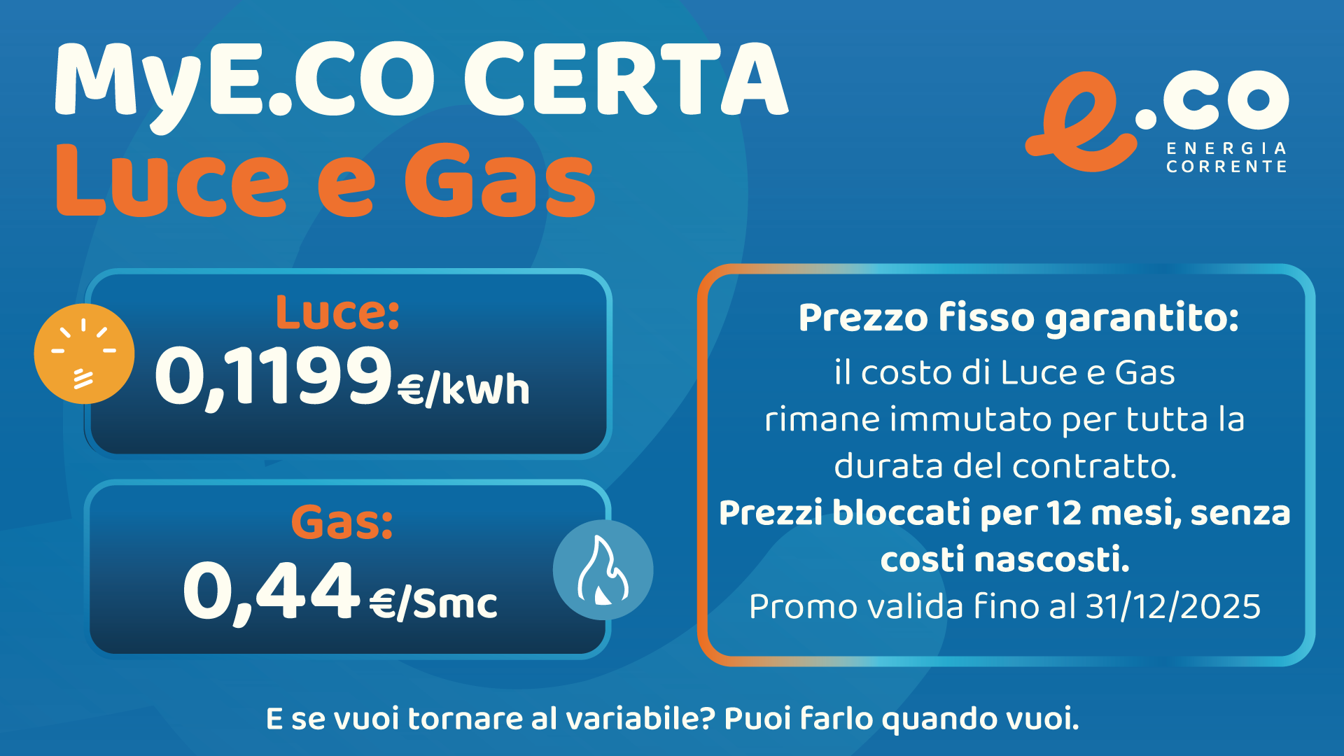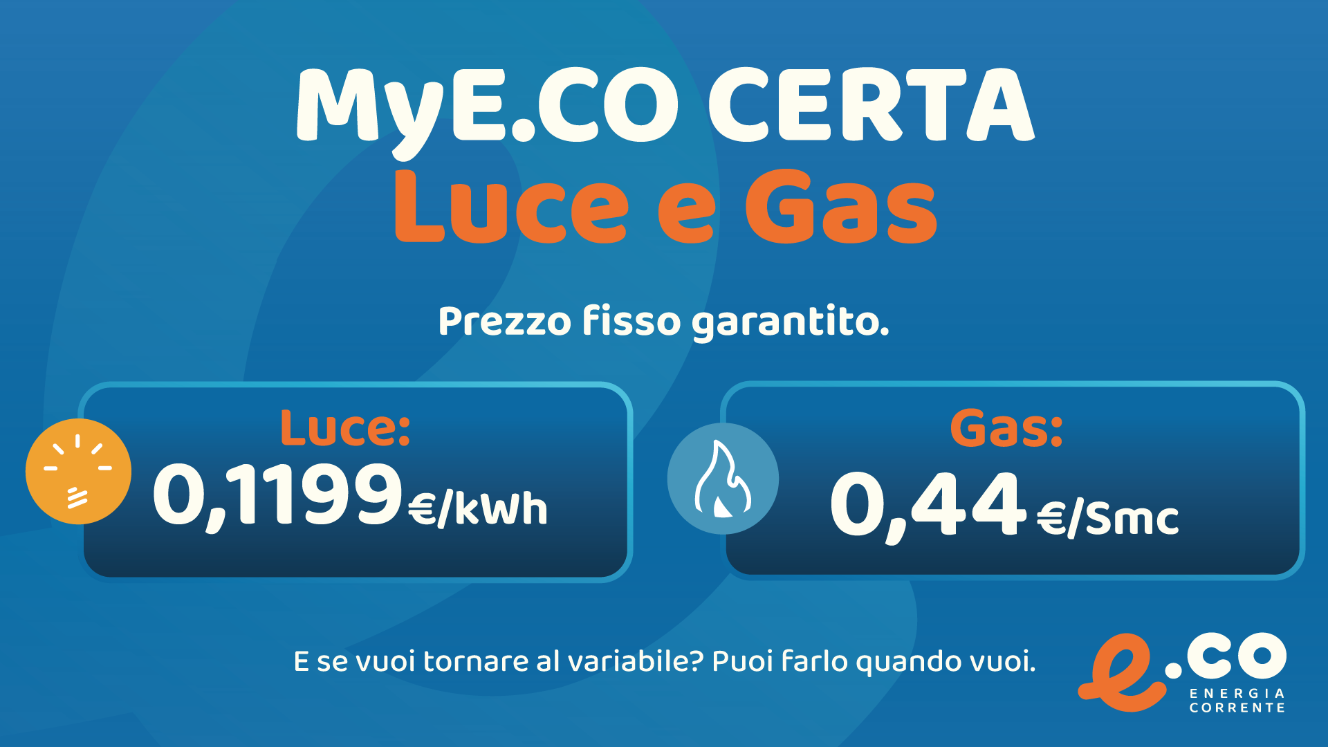 Con MyE.CO CERTA Luce e Gas hai prezzi bloccati per 12 mesi, senza voci nascoste e senza sorprese in bolletta.